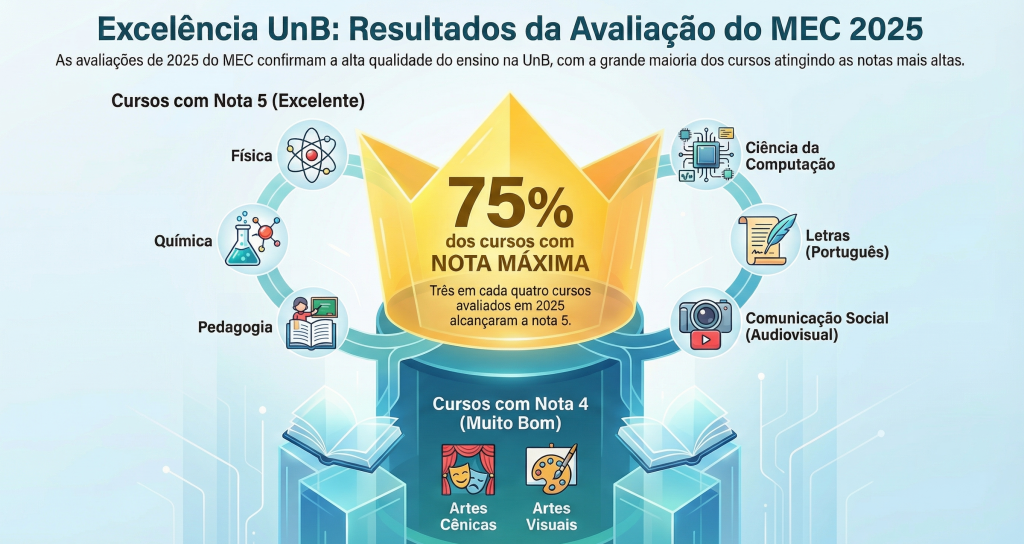 A Universidade de Brasília (UnB) consolidou seu padrão de qualidade superior nas avaliações in loco realizadas pelo Instituto Nacional de Estudos e Pesquisas Educacionais Anísio Teixeira (Inep) ao longo de 2025. Mesmo diante de um cenário de desafios operacionais, a instituição alcançou resultados expressivos: dos oito cursos avaliados no período, seis obtiveram a nota máxima (5) e dois conquistaram a nota 4, patamar considerado de alta qualidade.
